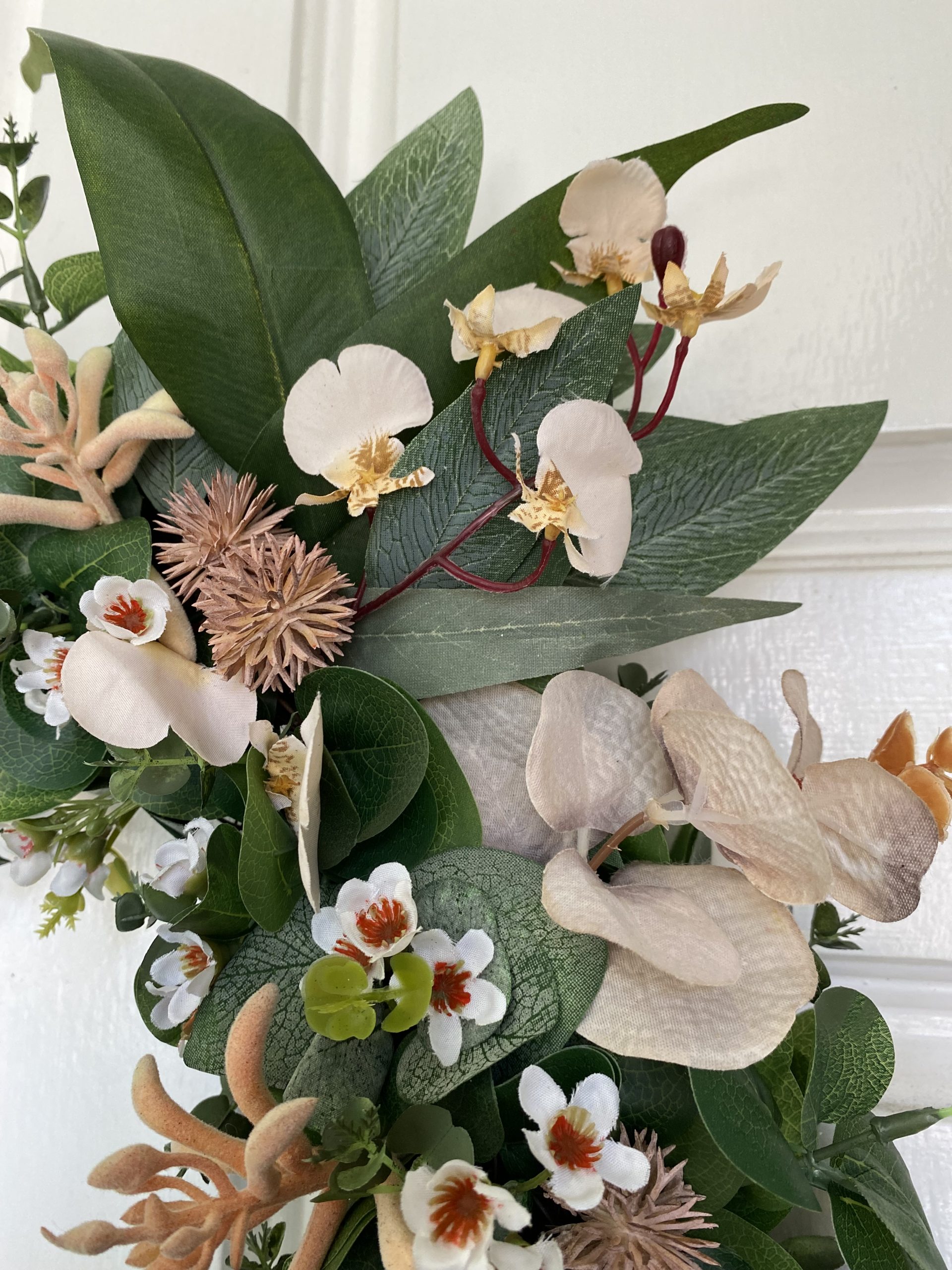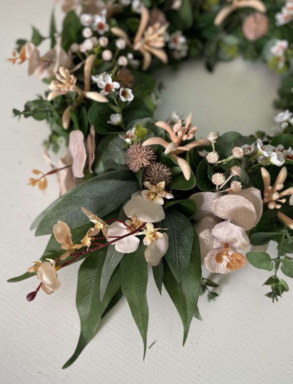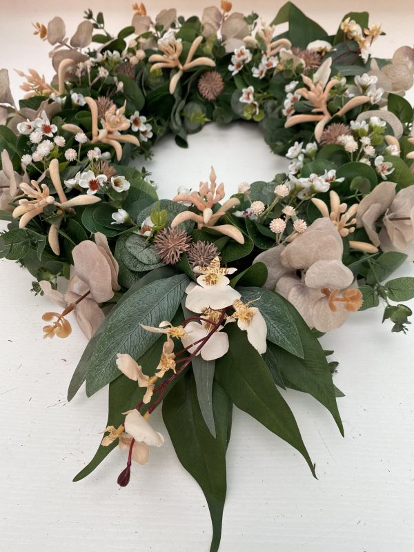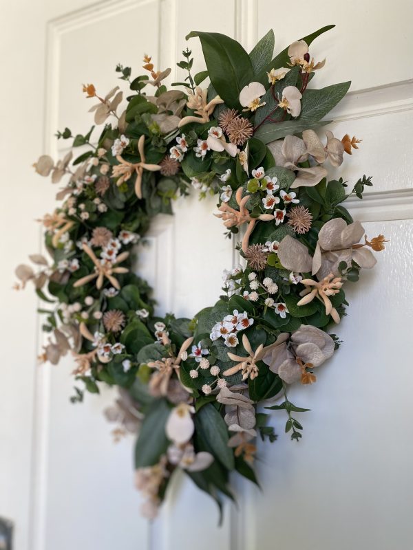 We start with a natural twig Wreath and as we have a love of Australian Natives we sourced the highest quality faux flora. We then weave input to 90 individual elements. Starting with green eucalyptus leaves and then filling it with Kangaroo Paw, Geraldton Wax Flowers, Billy buttons and long gum leaves. Each wreath is laden with flora and measures from 45-50cm in diameter!