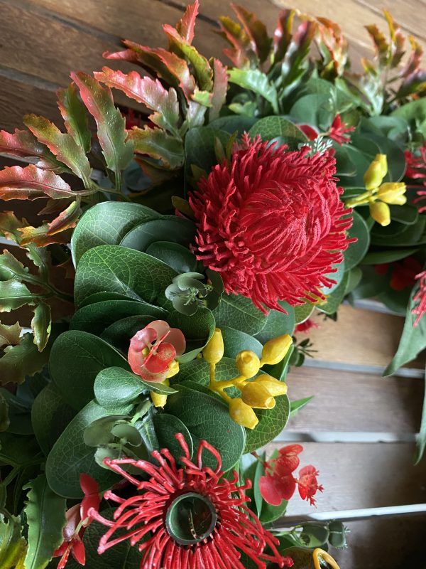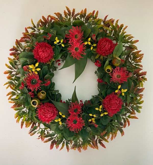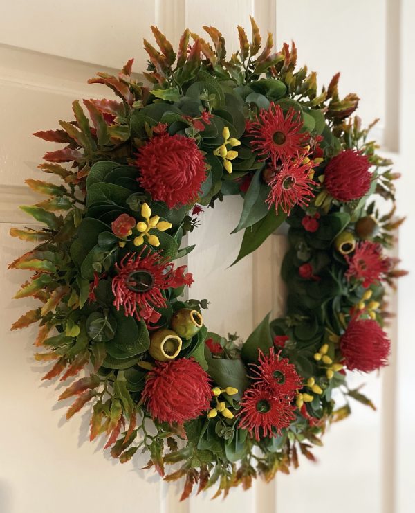Celebrate the Christmas season with this Native wreath featuring faux Waratahs and Gum Blossoms nestled amongst eucalyptus leaves.
