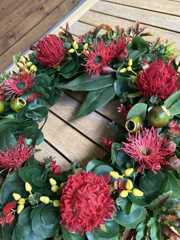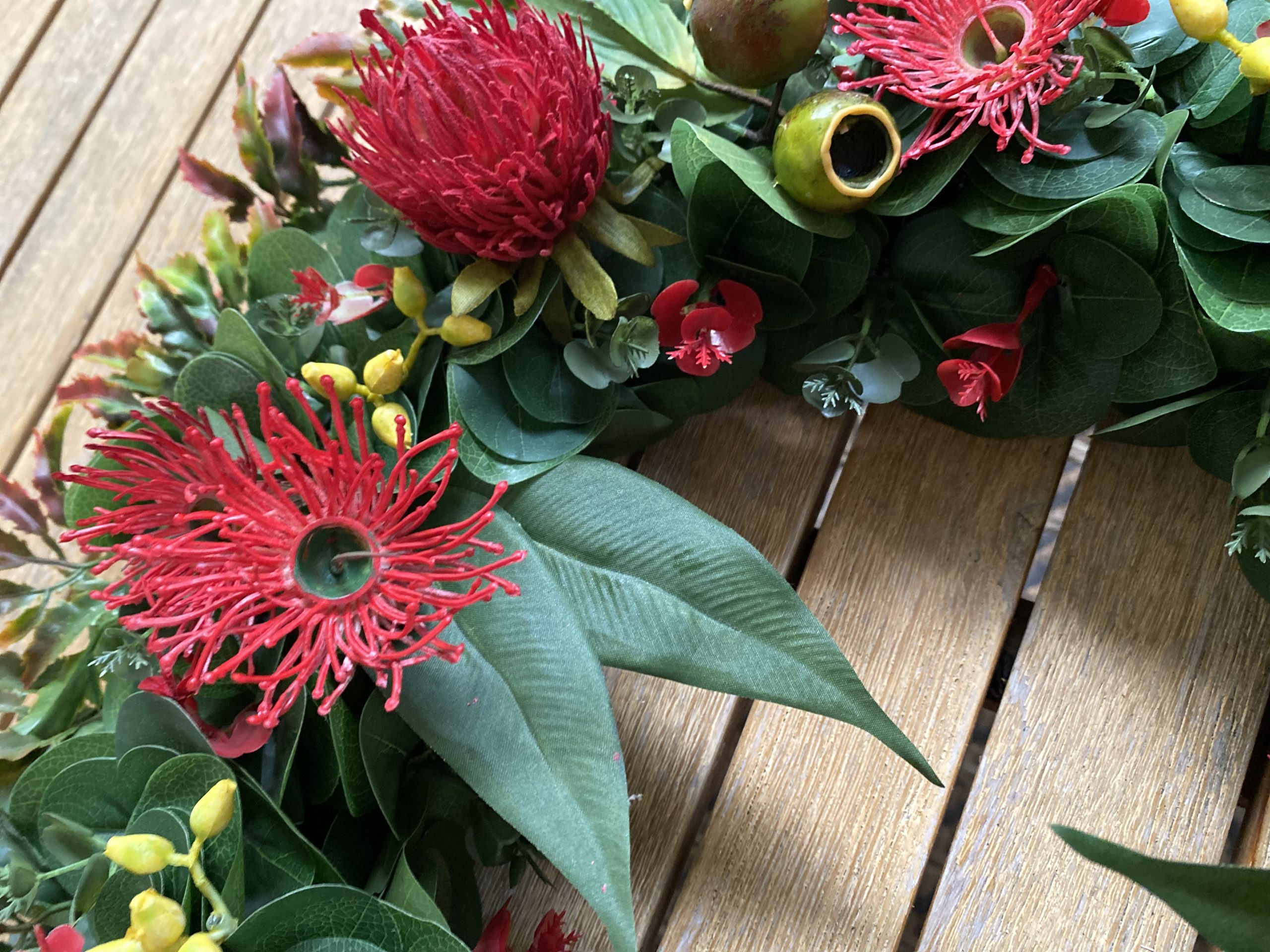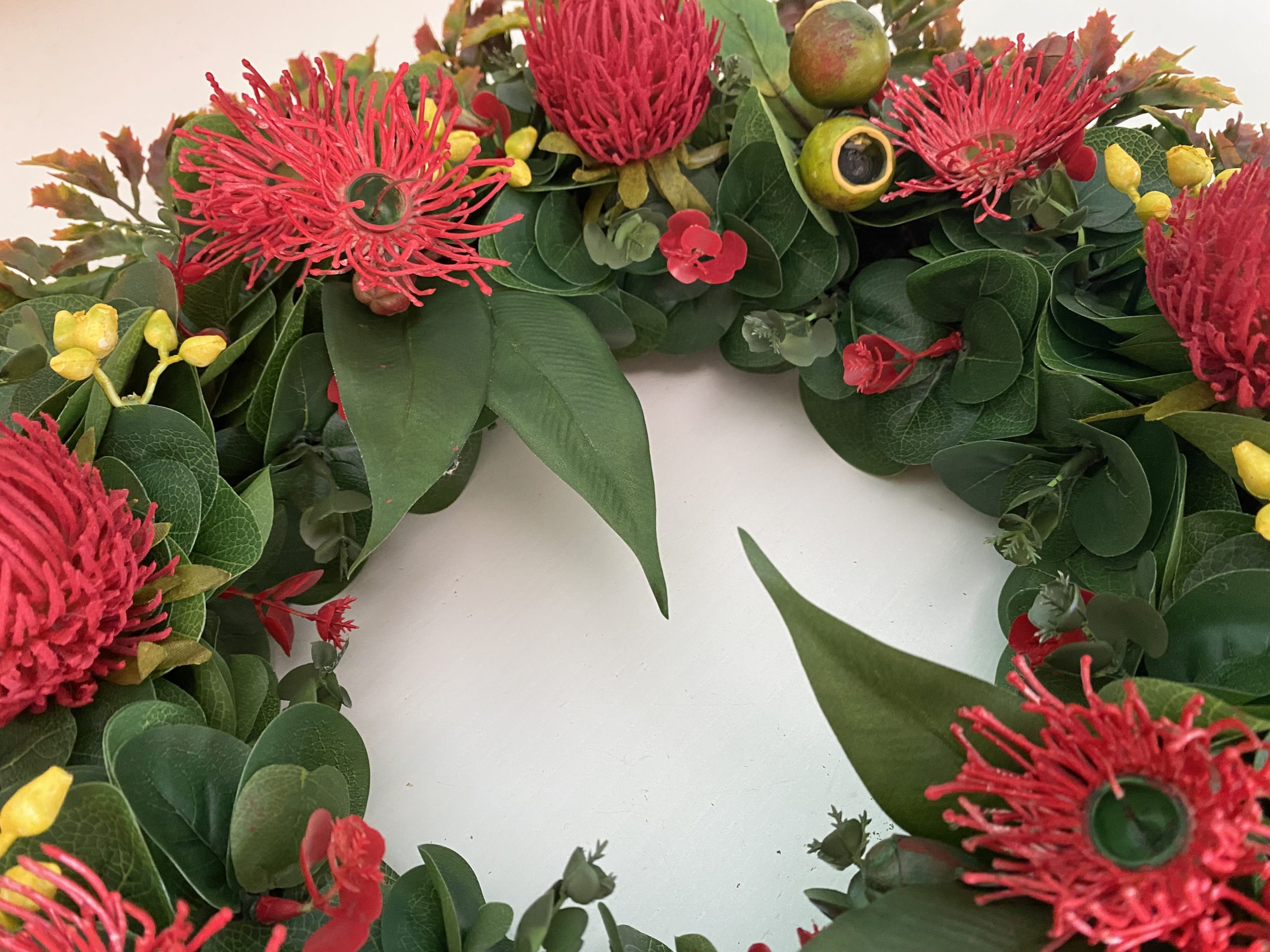 Inspired by Christmas reds, this wreath takes the usual colours and design of a traditional wreath but replaces the American flora with Australian flowers and leaves.
